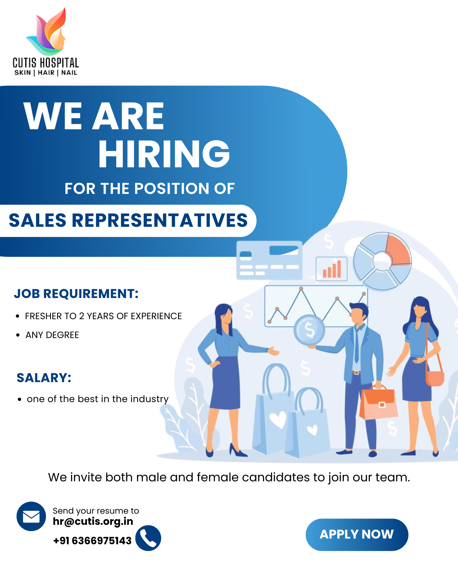 You can apply by filling out the application form on our Careers page or by sending your updated resume to our official email ID-hr@cutis.org.in