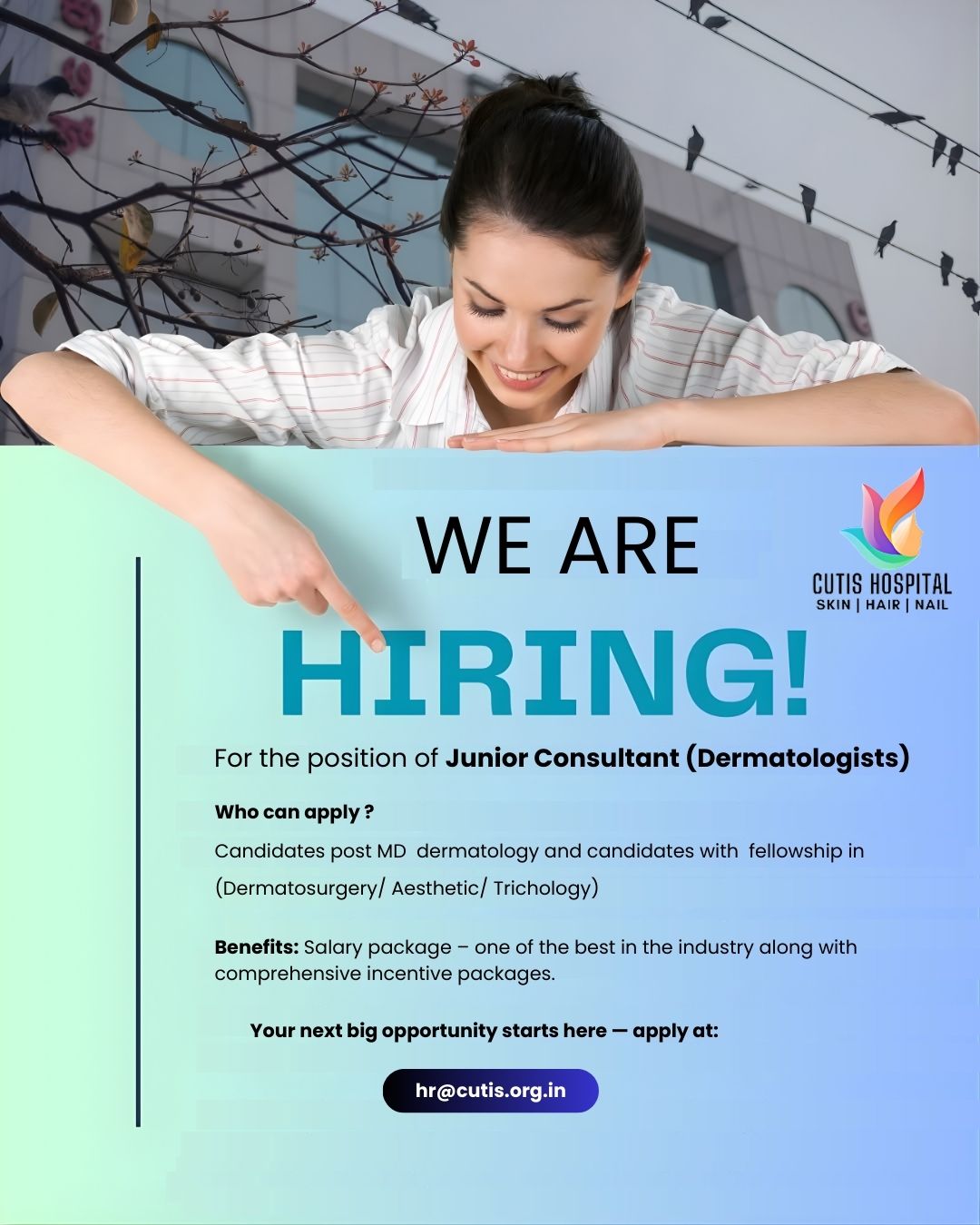 For any career-related questions, you can email us at hr@cutis.org.in or contact- +91 63669 75143 our HR department.